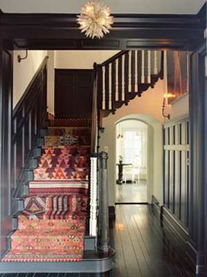 I picked a flat weave wool rug off Overstock (or, I guess it's "O.Co" now). It's about 2.7" by 10 feet, which left me about 12" of length. It's flipped over the top step here and I think I might secure it down and leave it rather than try to cut the wool. I also used some carpet padding on each step for softness.